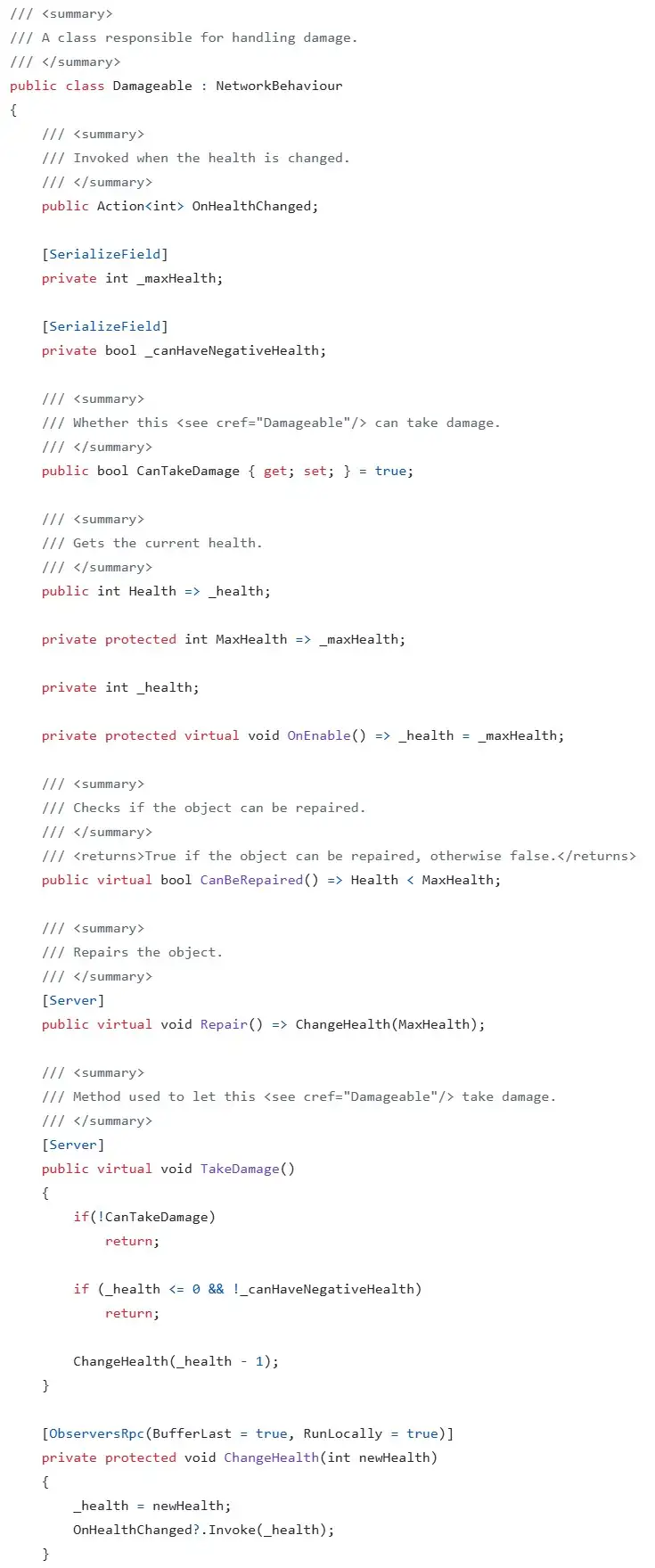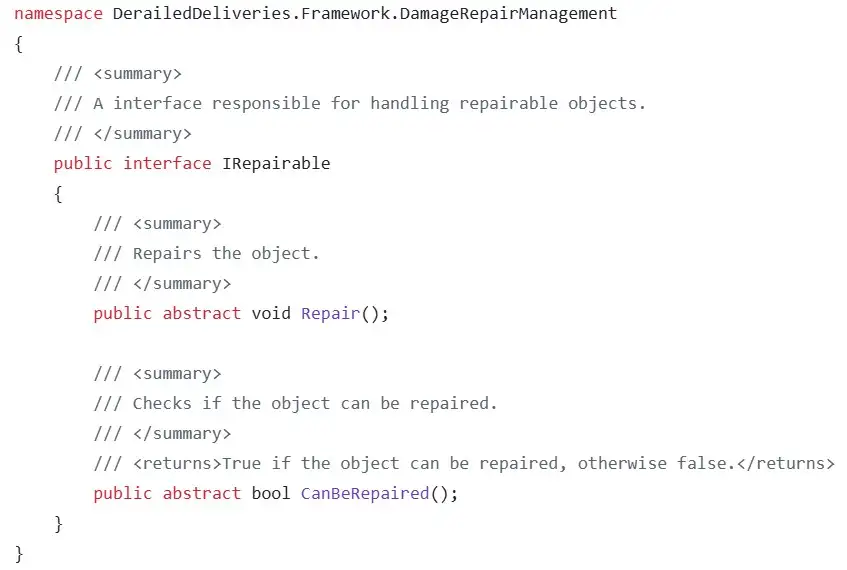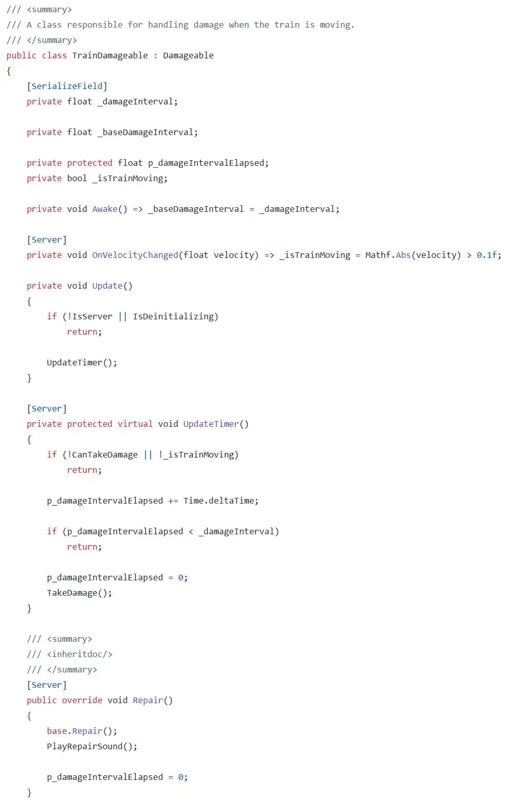 Ik heb dit technisch makkelijk gemaakt om te gebruiken in systemen. Om bijvoorbeeld een object repareerbaar te maken, hoeft de class simpelweg de IRepairable interface te implementeren. De hamer zoekt vervolgens binnen zijn bereik automatisch naar deze interface om de reparatie uit te voeren. Daarnaast heb ik ook een basis-damagable en basis-traindamagable gemaakt om makkelijk nieuwe objecten te kunnen maken die schade kunnen krijgen.
