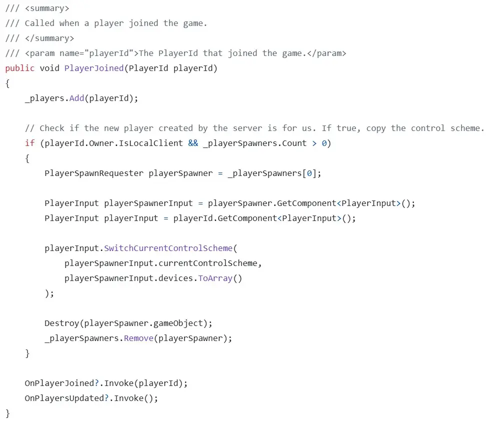 Dit proces verloopt via het netwerk. De client stuurt een verzoek naar de host om een speler in te spawnen. Zodra de client de gespawnde speler vanuit de host heeft ontvangen, koppel ik direct het juiste input device aan dit nieuwe character.