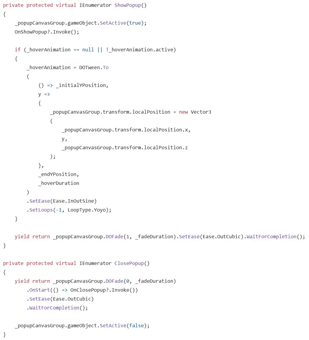 Het popup-systeem heb ik gemaakt om heel makkelijk nieuwe popups te kunnen toevoegen, compleet met standaard fade-in, fade-out en hover-animaties. Omdat we voor deze game heel veel verschillende popups nodig hadden, was dit een belangrijk systeem.